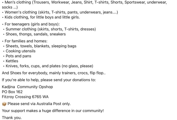 Join 40,000 supporters, and our remote opshop community partners on Facebook for real-time updates on what’s needed most.
